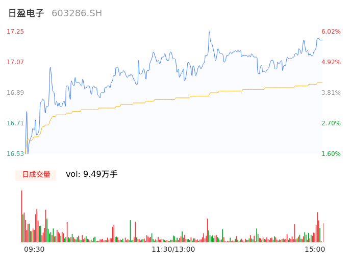 04月24日,日盈电子收报17.21,股价涨幅5.78%,成交金额1.61亿元,换手率8.30%。