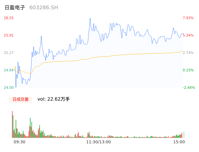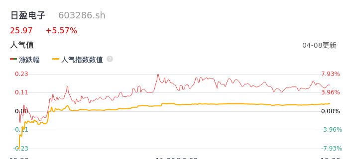 04月08日,日盈电子收报25.97,股价涨幅5.57%,成交金额5.73亿元,换手率25.68%。