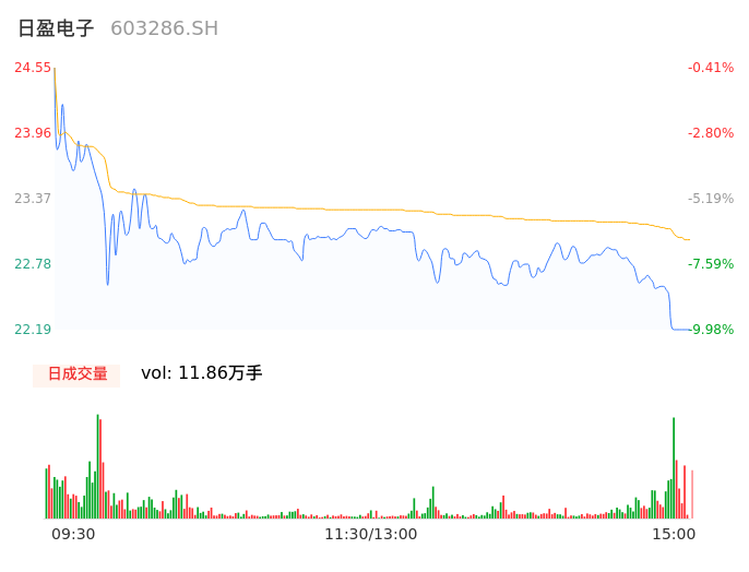 04月10日,日盈电子收报22.19,股价涨幅-9.98%,成交金额2.73亿元,换手率13.47%。
