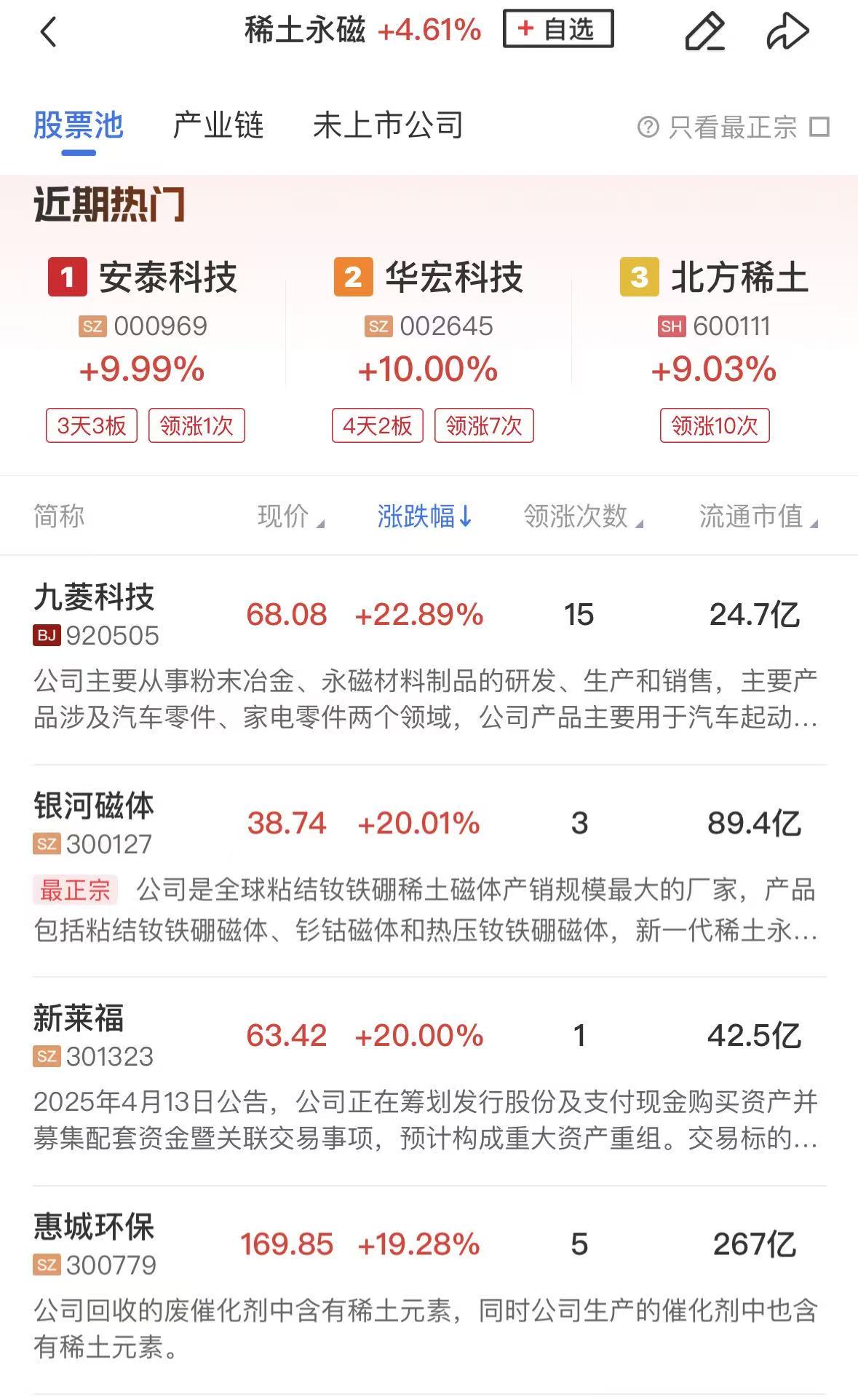 板块上,稀土永磁概念股涨幅居前,银河磁体、新莱福、包钢股份、华宏科技等个股涨停,北方稀土逼近涨停,三川智慧、金力永磁、钢研纳克同样涨幅居前。