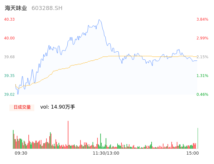 04月29日,海天味业收报39.57,股价涨幅1.88%,成交金额5.91亿元,换手率0.27%。