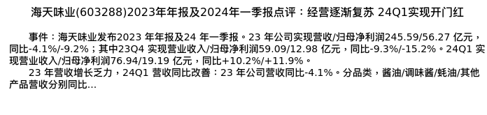 值得注意的是:2024年04月光大证券的陈彦彤/汪航宇/聂博雅分析师,首次发布关于海天味业的研究报告,标题为:海天味业(603288)2023年年报及2024年一季报点评:经营逐渐复苏 24Q1实现开门红。