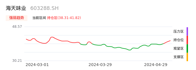 我们来看一下该股的九方特色指标强弱趋势的情况:海天味业近日从观望区上穿到持仓区。股价短期站稳多头区域,上升动能仍较为充足,可积极关注。后续重点关注上方压力位:41.82元是否能突破上攻。