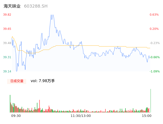 04月30日,海天味业收报39.26,股价涨幅-0.78%,成交金额3.15亿元,换手率0.14%。
