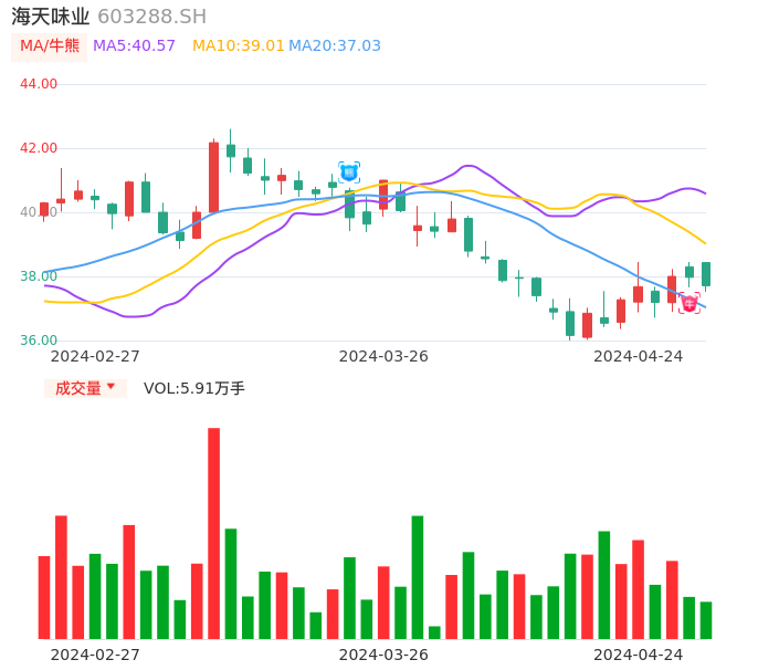 04月24日,海天味业收报37.71,股价涨幅-0.68%,成交金额2.23亿元,换手率0.11%。