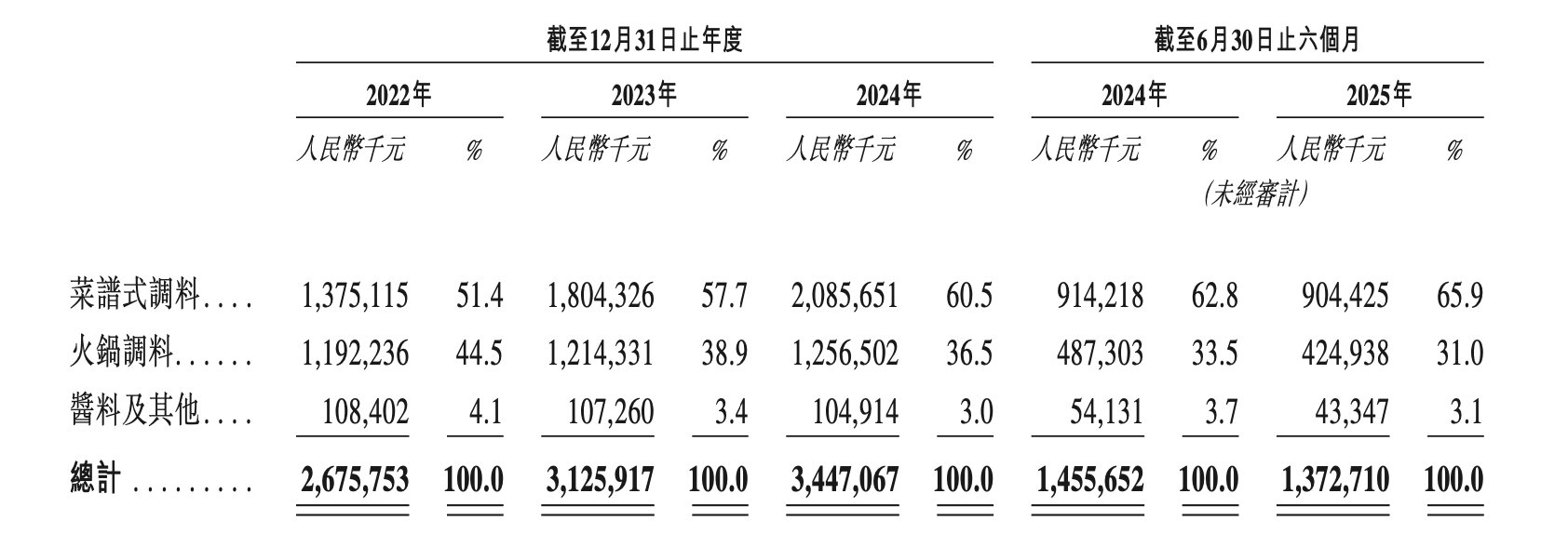 火锅调料作为公司传统优势业务,虽仍保持稳定运营,但增速明显放缓。2022年至2024年,该板块收入从11.92亿元微增至12.57亿元,年均增长率仅为约2.9%;营收占比则从44.5%逐年下降至2024年的36.5%,2025年上半年进一步降至31.0%。这反映出火锅底料市场整体趋于饱和,竞争加剧,叠加家庭端消费受餐饮外摆等因素影响,增长动能减弱。