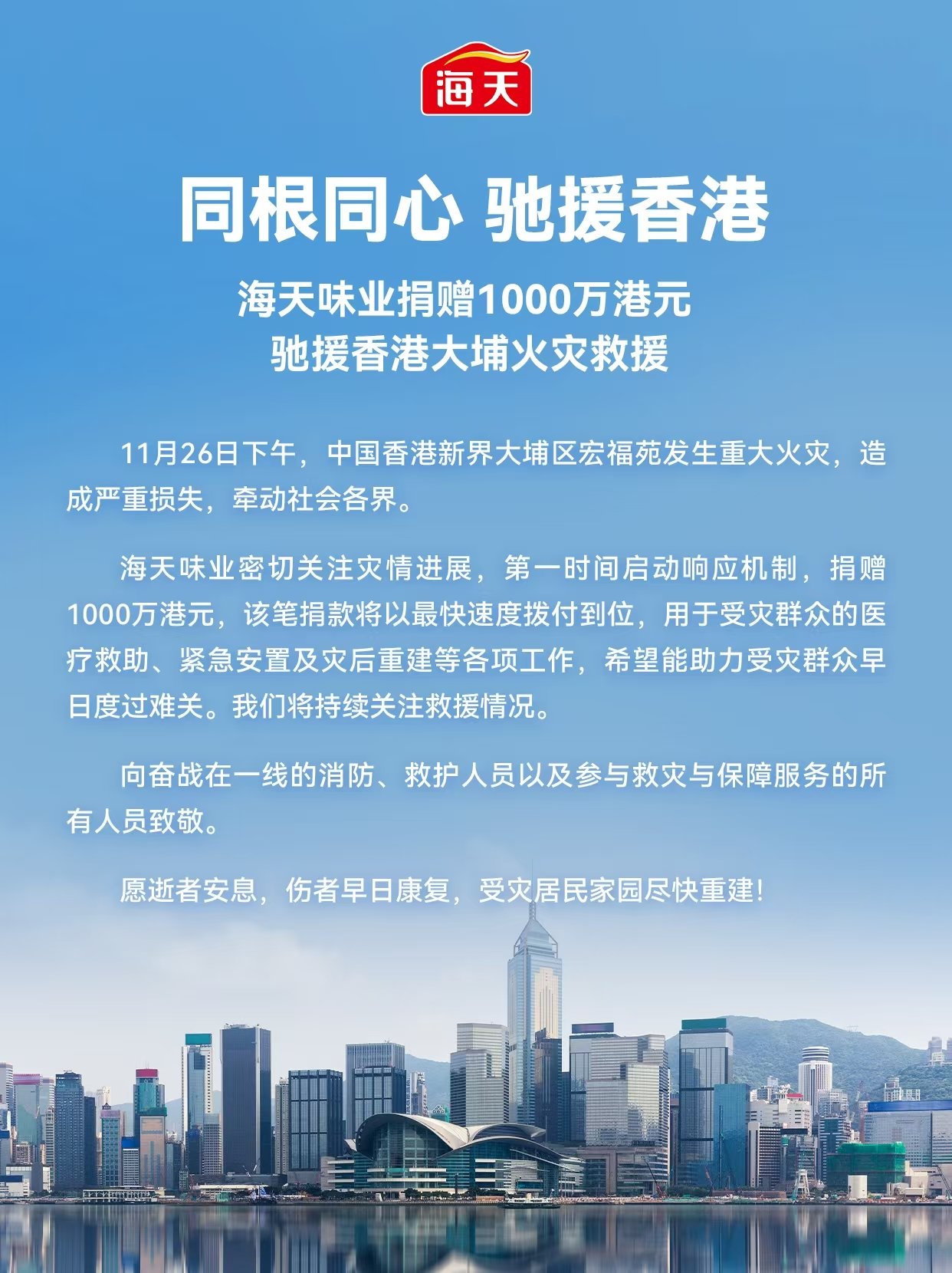 香港大埔区11月26日发生重大火灾事故,造成人员伤亡及财产损失。调味品龙头企业海天味业高度关注灾情进展,第一时间启动响应机制,于今日宣布紧急捐赠1000万港元,用于受灾群众的医疗救助、紧急安置及灾后重建等各项工作,希望能助力受灾群众早日度过难关。