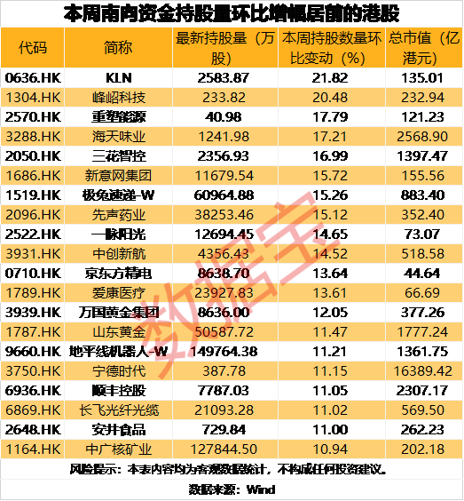 人民财讯9月7日电,近一周(9月1日-9月5日)20股获得南向资金持股量环比增长超10%,其中KLN、峰岹科技持股量环比增长20%以上,获得南向资金大幅度加仓,其他还有重塑能源、海天味业、三花智控等股持股量增幅在15%以上。从港股通持股占港股总股数比例来看,当周港股通大幅加仓的个股中,长飞光纤光缆、山东黄金最新持股比例居前,分别达到59.98%、58.88%。