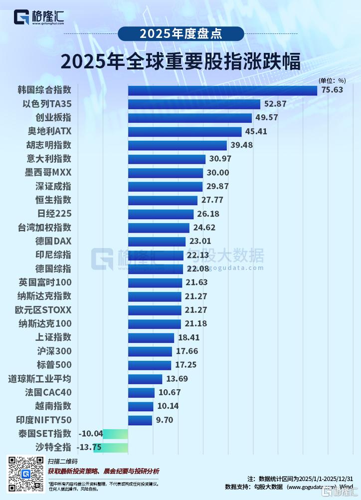 港股方面,恒生指数2025年累涨27.77%,创下自2017年以来最佳年度表现。恒生科技指数、恒生中国企业指数分别涨23.45%和22.27%。