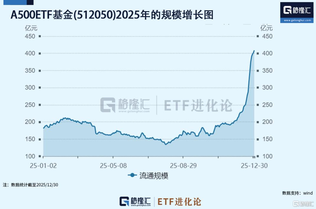 资金大举买入背后是A500ETF基金(512050)业绩的亮眼,2025年全年累涨25.05%,跑赢业绩基准2.63个百分点,2025年规模接连突破200亿、300亿、400亿三道关口,最新规模为408.75亿元,较年初的184.12亿元增长122%。
