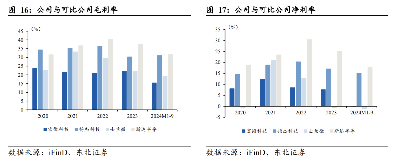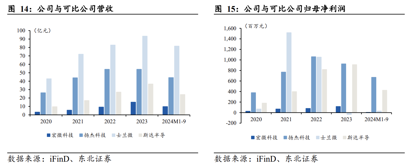 公司2021年上市,营收及归母净利润尚处成长期。从行业来看,2020-2023年,各公司营收呈快速上升趋势;2024M1-9受国内行业竞争加剧,去库存压力较大及各行业降价等因素影响,功率几家相关公司营收均存在不同程度同比下降。分公司来看,2023年,公司营收达15.0亿元,扬杰科技/士兰微/斯达半导营收分别为44.2/81.6/24.1亿元;公司归母净利润达1.16亿元,扬杰科技/士兰微/斯达半导归母净利润分别为9.24/-0.36/9.10亿元。