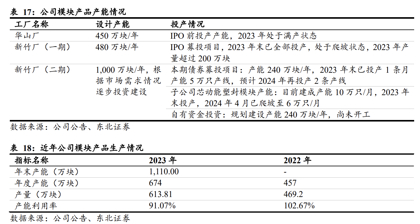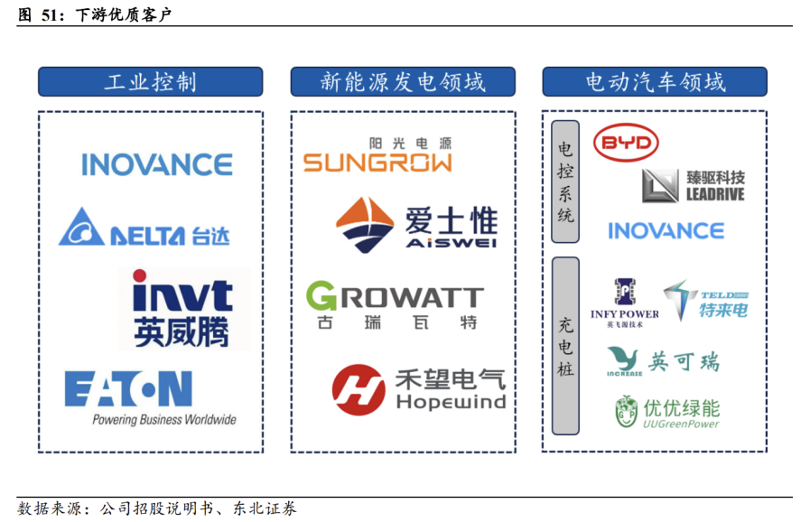 依托优质大客户,提高下游市场份额。经过多年的积累,公司已拥有较为丰富的优质客户资源,与行业龙头或知名企业客户建立了较为稳定的配套合作关系。同时,公司依托龙头企业产生的市场效应不断向行业内其他企业拓展。在工业控制领域,客户包含苏州汇川、台达集团、英威腾、伊顿等;在新能源发电领域,重点客户包含客户A、阳光电源、爱士惟、古瑞瓦特、禾望电气等。2023年8月公司与A客户签订产能保障协议,截至2023年末合同约定的模块产品实际产能已达到14万块/月,处于爬坡状态;在新能源汽车领域,公司产品主要用于电控系统、DC电源,主要客户有比亚迪、汇川、臻驱等。公司产品直供比亚迪,并通过Tier1导入广汽埃安、赛力斯等终端品牌,2023年装车总量突破了40万台;在充电桩领域,公司主要客户有英飞源、英可瑞、优优绿能、特来电等。经过较长时间的技术开发与多维度可靠性验证,公司相关产品质量技术指标达到客户要求。