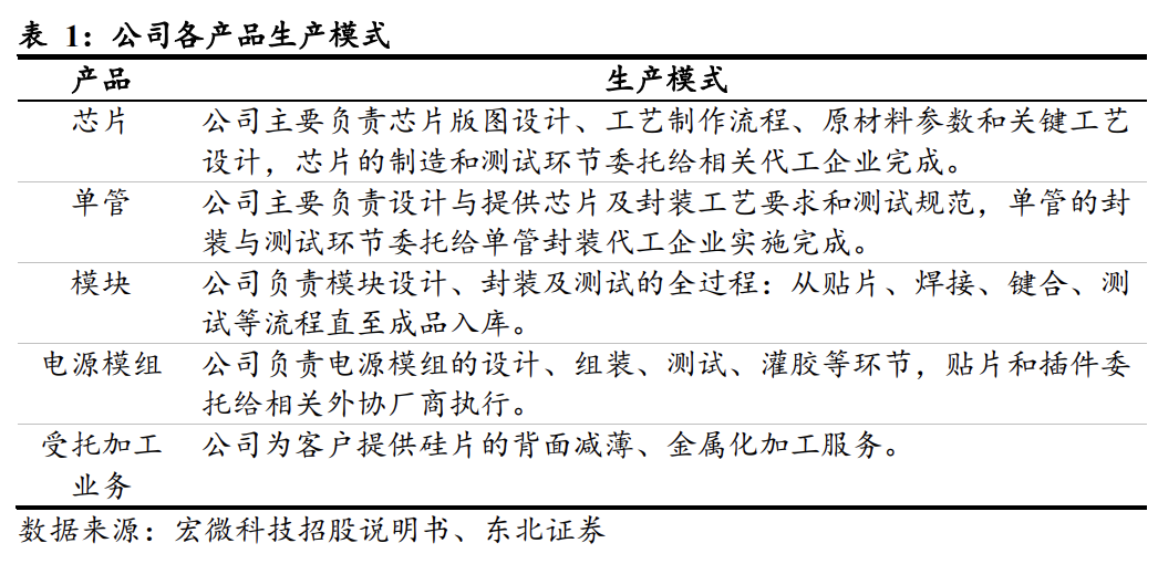 芯片及单管产品采用Fabless模式,模块和电源模组采用自产模式。公司专注于芯片的研发和设计,将设计好的芯片委托给芯片代工企业制造。芯片生产完成后,单管产品委托封测厂进行封装测试,模块和电源模组产品由公司通过自有产线进行模块化封装与测试及电源模组产品的组装与测试。目前公司已经与华虹宏力、积塔、华润华晶等芯片代工企业建立了长期稳定合作关系,其中华虹宏力、积塔负责IGBT芯片代工业务,华润华晶负责FRED芯片代工业务。公司主要的封测厂商包括无锡德力芯、天水华天、南通华达等。