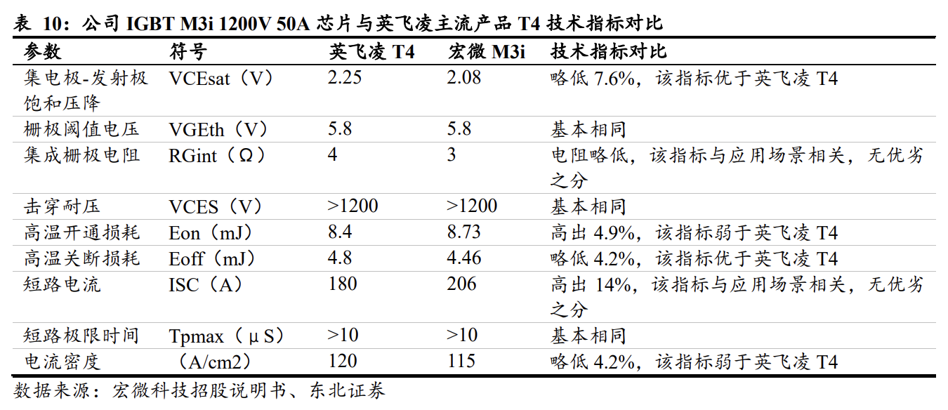 宏微IGBTM3芯片与英飞凌市场主流芯片在关键参数方面指标相近。公司于2017年开始推出并实现量产的宏微第三代IGBTM3i1200V系列电流覆盖10A到200A,选取其中典型的50A和英飞凌于2010年推出的市场主流的英飞凌T4同规格产品关键参数做横向对比,通过对比可以发现,公司的芯片关键参数中的击穿耐压、短路极限时间方面基本相同,在芯片损耗、电流密度等重要指标方面与英飞凌芯片指标相接近。