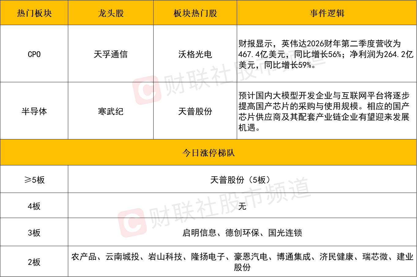 板块上,算力硬件方向延续强势,天孚通信长飞光纤沃格光电涨停,东田微德科立生益电子中际旭创鹏鼎控股等个股涨幅居前。消息面上,财报显示,英伟达2026财年Q2营收为467.4亿美元,同比增长56%;净利润为264.2亿美元,同比增长59%,并且第三季度的指引也较为稳健。