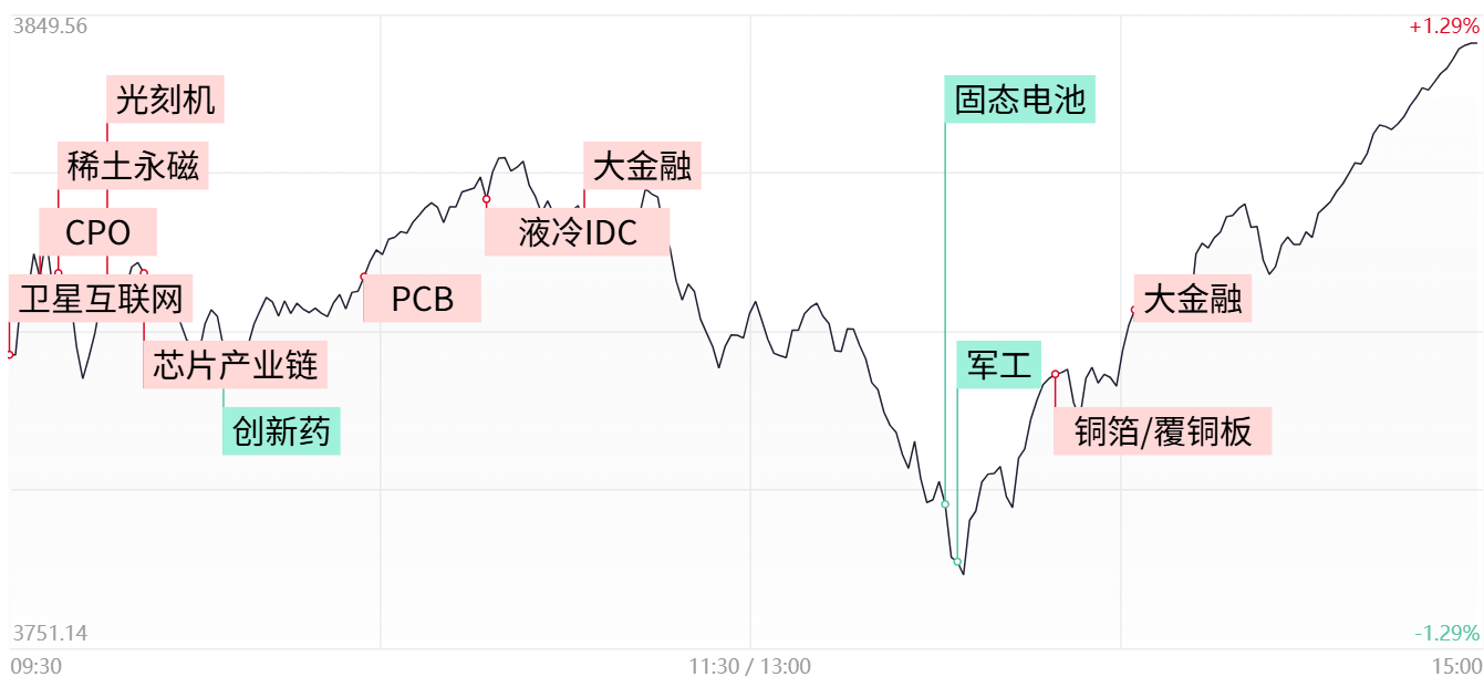 今日午后市场再现“V”型反弹,三大指数全线收红,科创50指数涨超7%。指数在经历了昨日放量调整后,仅时隔一日便获得资金的回流修复,再次彰显出目前市场强劲的承接动能。后续首要关注依旧是量能,市场若想要延续强势上涨仍需维持2.8万亿以上的水平,反之若量能出现连续萎缩的话,短线仍可能会经历一定的震荡。此外虽然近期指数维持强势,但市场整体还是以结构性分化为主,绝大多数的赚钱效应集中在算力和芯片方向,并且相关核心标的呈现加速上涨态势,在增量资金持续涌入下,AI产业链所主导的科技行情尚不可轻易言顶,但短线节奏上仍需警惕情绪过热导致波动加剧的可能性。