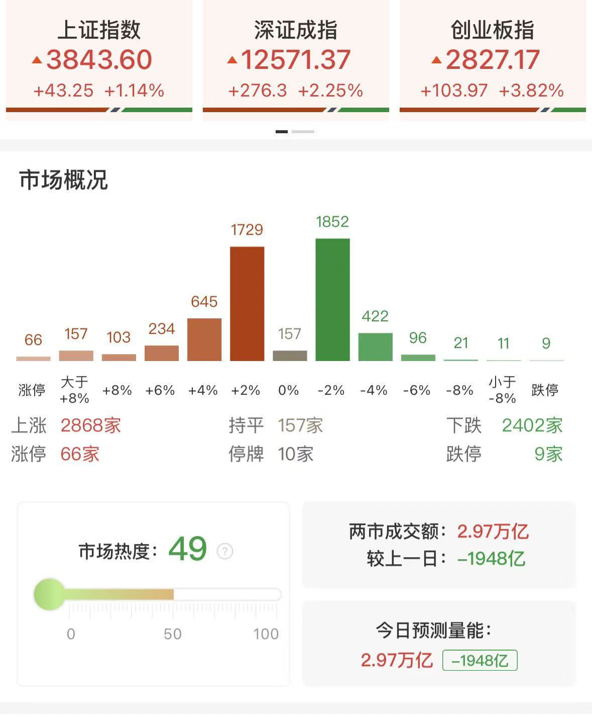 财联社8月28日讯,市场午后V型反弹,三大指数全线收红,科创50指数涨超7%,寒武纪、中芯国际双双创历史新高。沪深两市全天成交额2.97万亿,较上个交易日缩量1948亿。盘面上,市场热点集中在算力和芯片方向,个股涨多跌少,全市场超2800只个股上涨。从板块来看,CPO等算力硬件股维持强势,天孚通信等多股续创历史新高。芯片股集体大涨,张江高科等10余股涨停。下跌方面,医药股展开调整,南新制药等多股跌超5%。截至收盘,沪指涨1.14%,深成指涨2.25%,创业板指涨3.82%。