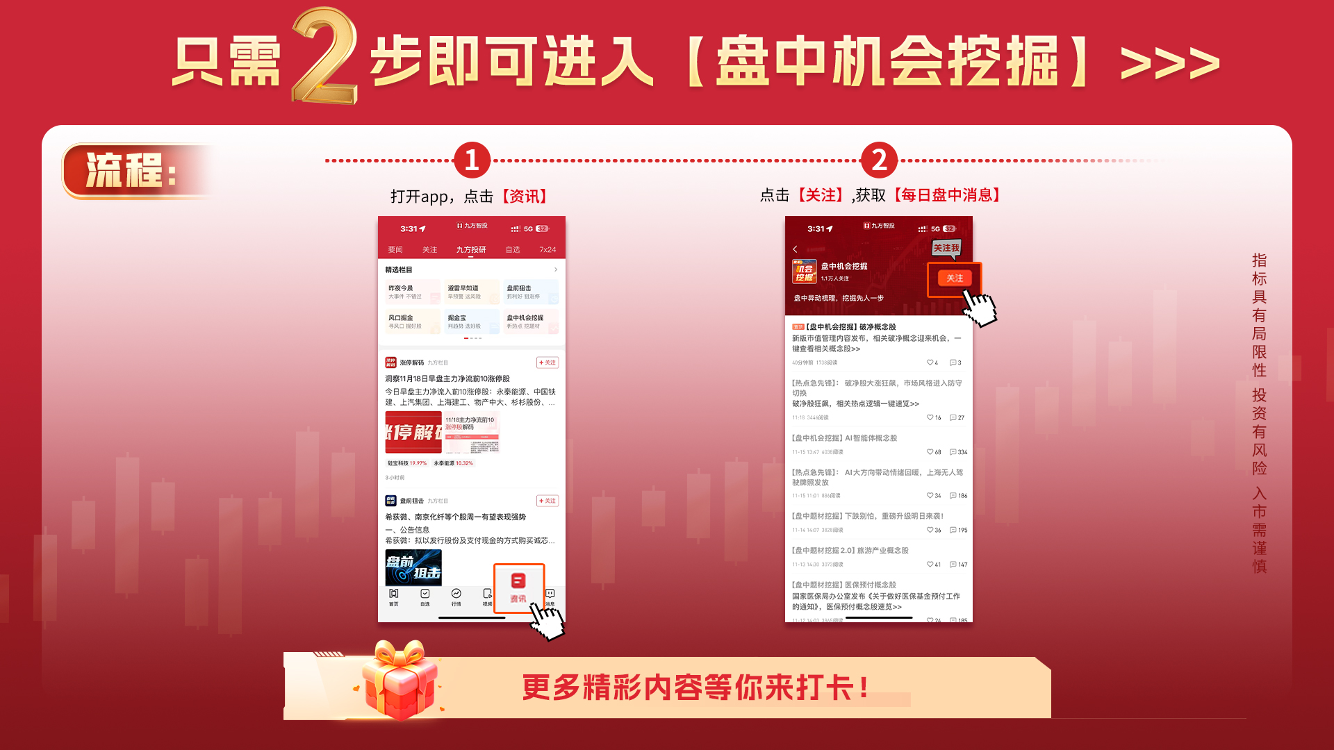 热点急先锋,聚焦最前沿,每天都在更新盘中最新异动的题材,想要更快及时获取盘中题材,请点击“资讯”然后点击“九方投研”,找到《盘中机会挖掘》栏目就可以关注啦!