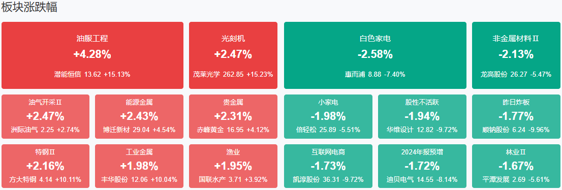 板块方面,油气、光刻机、有色金属、软件开发等板块涨幅居前,家电、电商、银行、电网设备等板块跌幅居前。