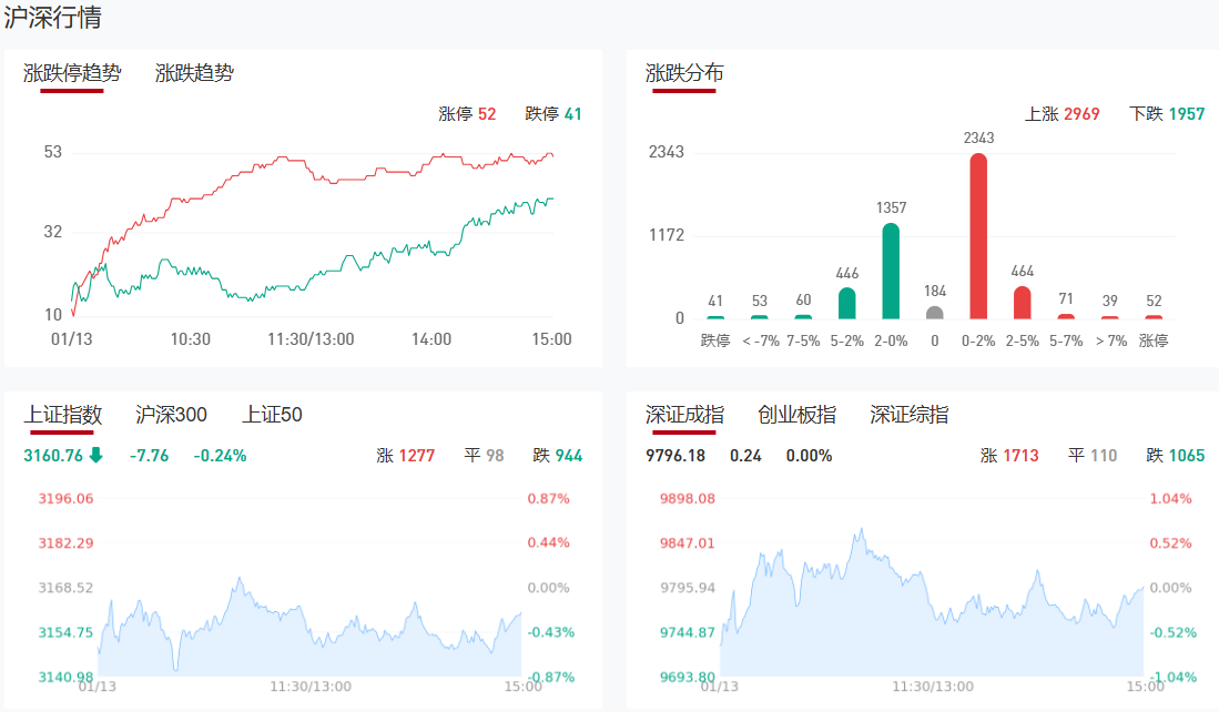 A股三大指数今日涨跌不一,截至收盘,沪指跌0.24%,深成指几乎平收,创业板指涨0.36%,北证50指数跌2.35%。全市场成交额9762亿元,较上日缩量1267亿元。全市场超3000只个股上涨。