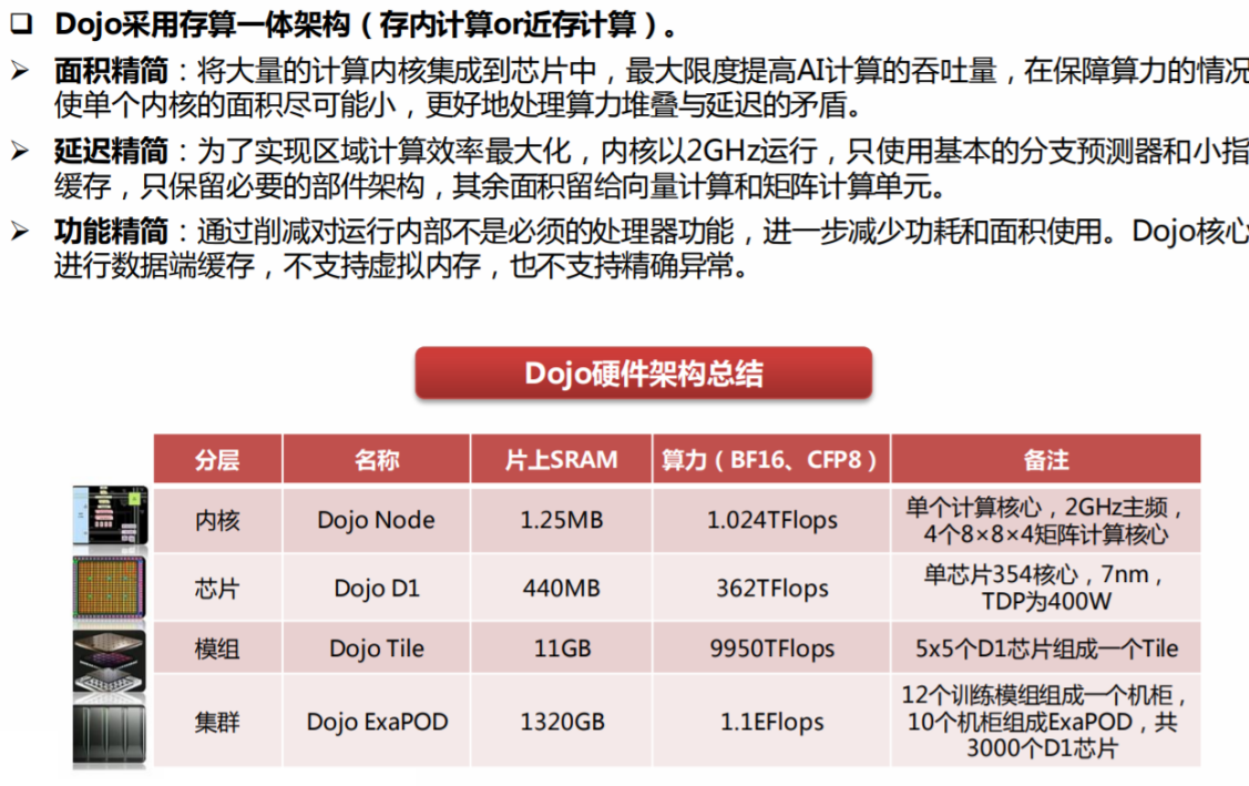 Dojo是基于特斯拉自研D1芯片的数据中心(主要训练FSD)用于替代目前基于A100的数据中心(截止22年9月,1.4万片A100,全球第七大数据中心)。2019年AIDay马斯克第一次提及(Dojo目标是解决海量视频数据的训练问题);Dojo的落地形式为ExaPOD(Dojo集群,由3000片D1芯片构成),单精度算力为1.1EFlops。