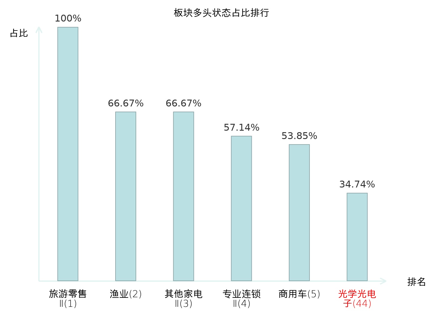 全市场所有行业板块中主力多头状态占比排名中,旅游零售Ⅱ板块位居第一。农产品加工板块名次提升最快,较昨日上升46位。