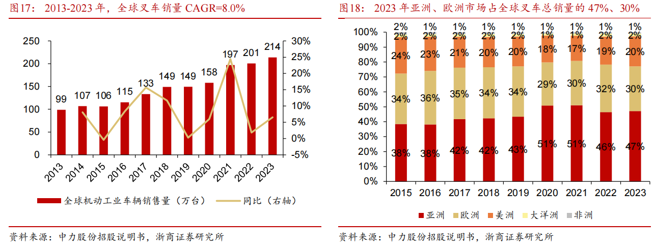 2023年全球叉车销量达214万台,其中亚洲、欧洲、美洲分别占47%、30%、20%。