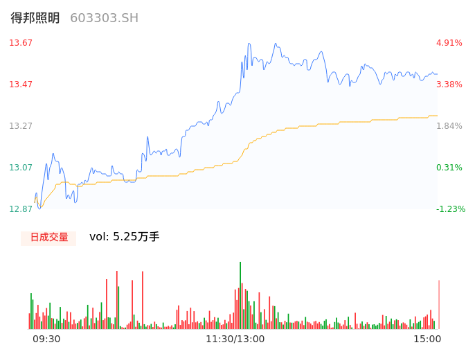 04月22日,得邦照明收报13.55,股价涨幅3.99%,成交金额6996.43万元,换手率1.10%。