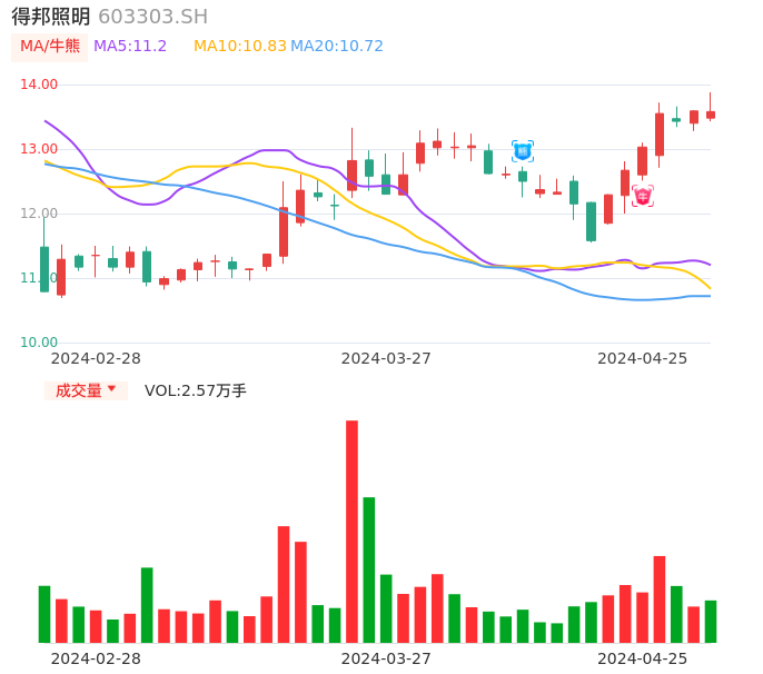 04月25日,得邦照明收报13.58,股价涨幅-0.07%,成交金额3490.00万元,换手率0.54%。