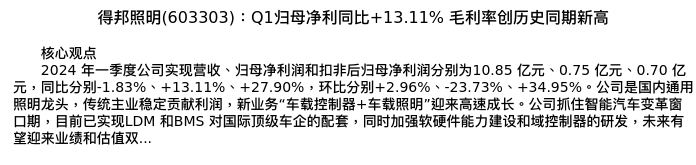 值得注意的是:2024年04月中信建投证券的陶亦然/程似骐分析师,首次发布关于得邦照明的研究报告,标题为:得邦照明(603303):Q1归母净利同比+13.11% 毛利率创历史同期新高。
