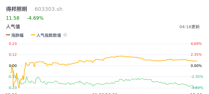 04月16日,得邦照明收报11.58,股价涨幅-4.69%,成交金额2899.47万元,换手率0.52%。