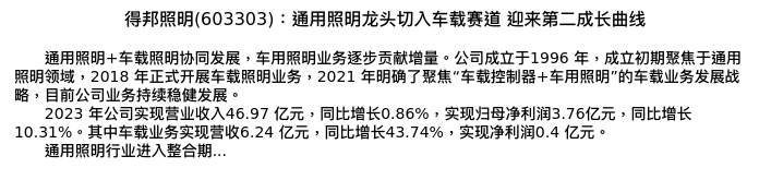 值得注意的是:2024年04月德邦证券的邓健全/赵悦媛/赵启政分析师,首次发布关于得邦照明的研究报告,标题为:得邦照明(603303):通用照明龙头切入车载赛道 迎来第二成长曲线。