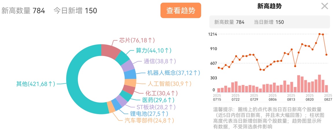从百日新高,判断板块轮动节奏还是比较准的,百日新高数据调整,市场情绪很好!目前是在芯片(自主可控)>算力>通信>机器人,目前依旧是芯片全面占据第一位,大科技虽有调整,但依旧是市场核心!