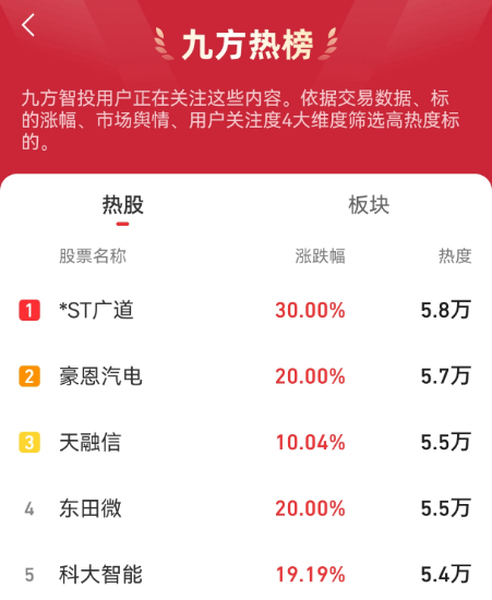 九方智投:*ST广道(北交所有退市风险),豪恩汽电、天融信、东田微、科大智能