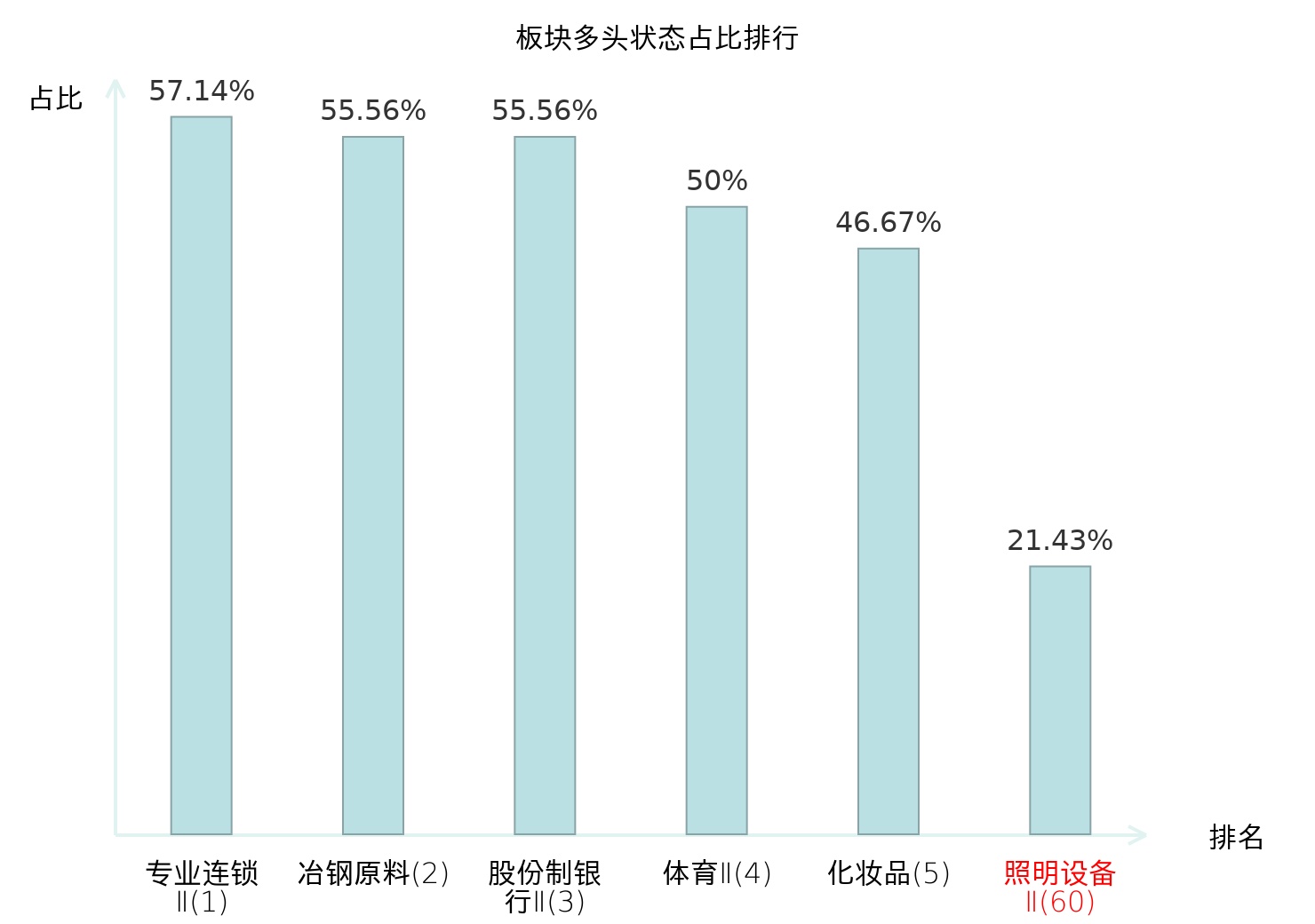 全市场所有行业板块中主力多头状态占比排名中,专业连锁Ⅱ板块位居第一。乘用车板块名次提升最快,较昨日上升85位。