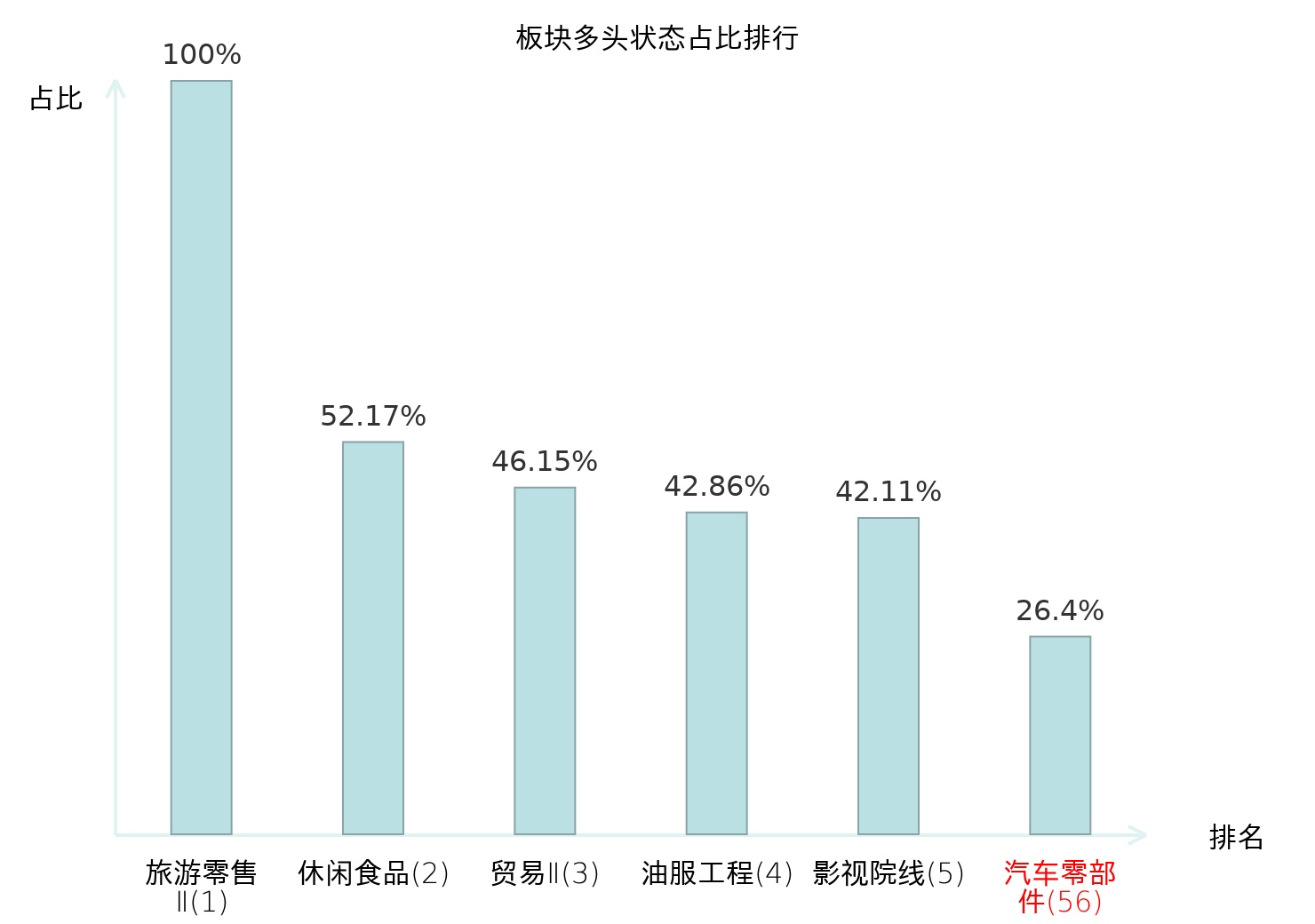 全市场所有行业板块中主力多头状态占比排名中,旅游零售Ⅱ板块位居第一。体育Ⅱ板块名次提升最快,较昨日上升99位。