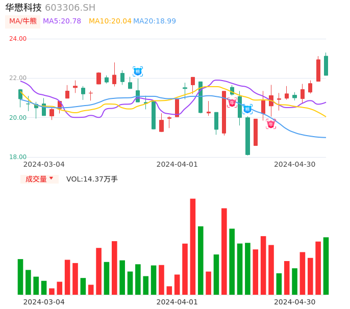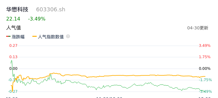 04月30日,华懋科技收报22.14,股价涨幅-3.49%,成交金额3.23亿元,换手率4.41%。