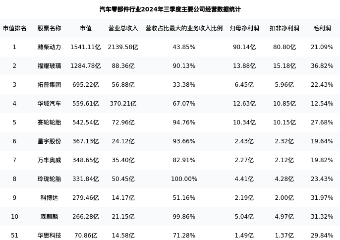 华懋科技最新报告期数据为三季度,下表汇总了汽车零部件行业内市值靠前的公司三季度主要经营数据