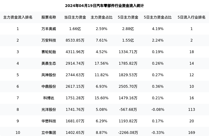 从主力资金流向来看,汽车零部件行业今日主力资金流入91.67亿元,在所有申万二级行业中排名:52/131。