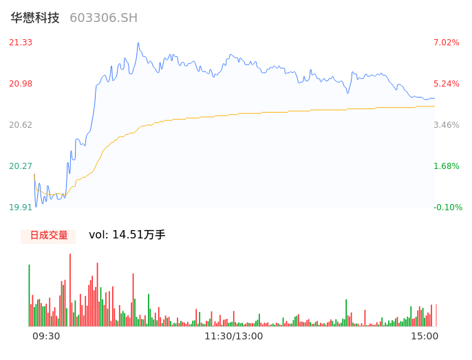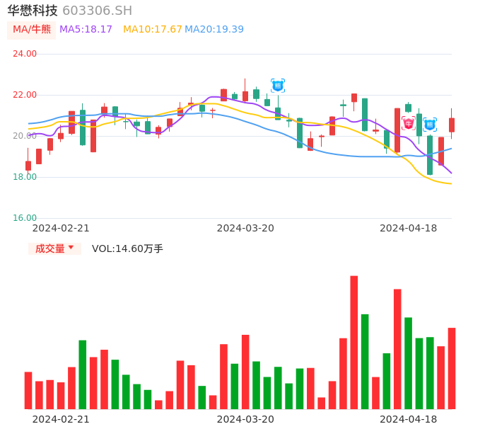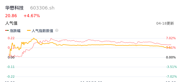 04月18日,华懋科技收报20.86,股价涨幅4.67%,成交金额3.03亿元,换手率4.48%。