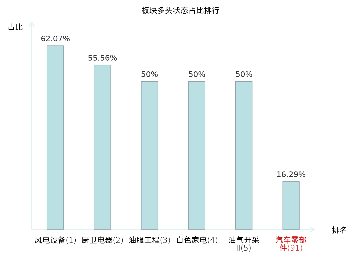 全市场所有行业板块中主力多头状态占比排名中,风电设备板块位居第一。专业连锁Ⅱ板块名次提升最快,较昨日上升65位。