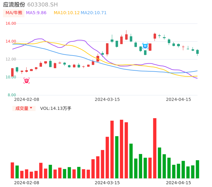 04月15日,应流股份收报12.62,股价涨幅-2.70%,成交金额1.79亿元,换手率2.07%。