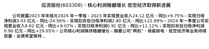 值得注意的是:2024年04月招商证券的胡小禹/吴洋/朱艺晴/方嘉敏分析师,首次发布关于应流股份的研究报告,标题为:应流股份(603308):核心利润稳健增长 低空经济取得新进展。