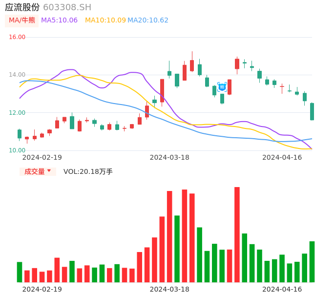 04月16日,应流股份收报11.61,股价涨幅-8.00%,成交金额2.40亿元,换手率2.95%。