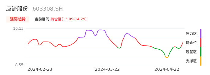 我们来看一下该股的九方特色指标强弱趋势的情况:应流股份近日从观望区上穿到持仓区。股价短期站稳多头区域,上升动能仍较为充足,可积极关注。后续重点关注上方压力位:14.29元是否能突破上攻。