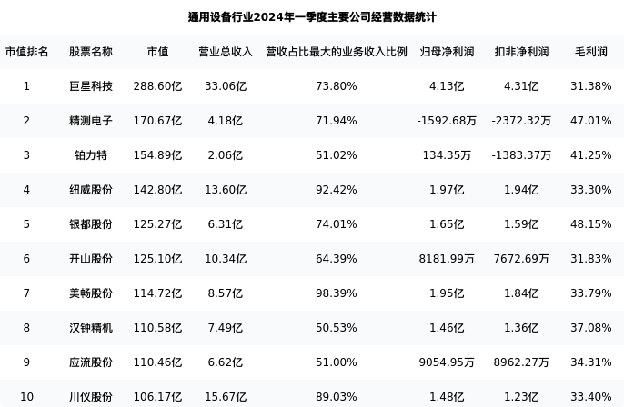 应流股份最新报告期数据为一季度,下表汇总了通用设备行业内市值靠前的公司一季度主要经营数据