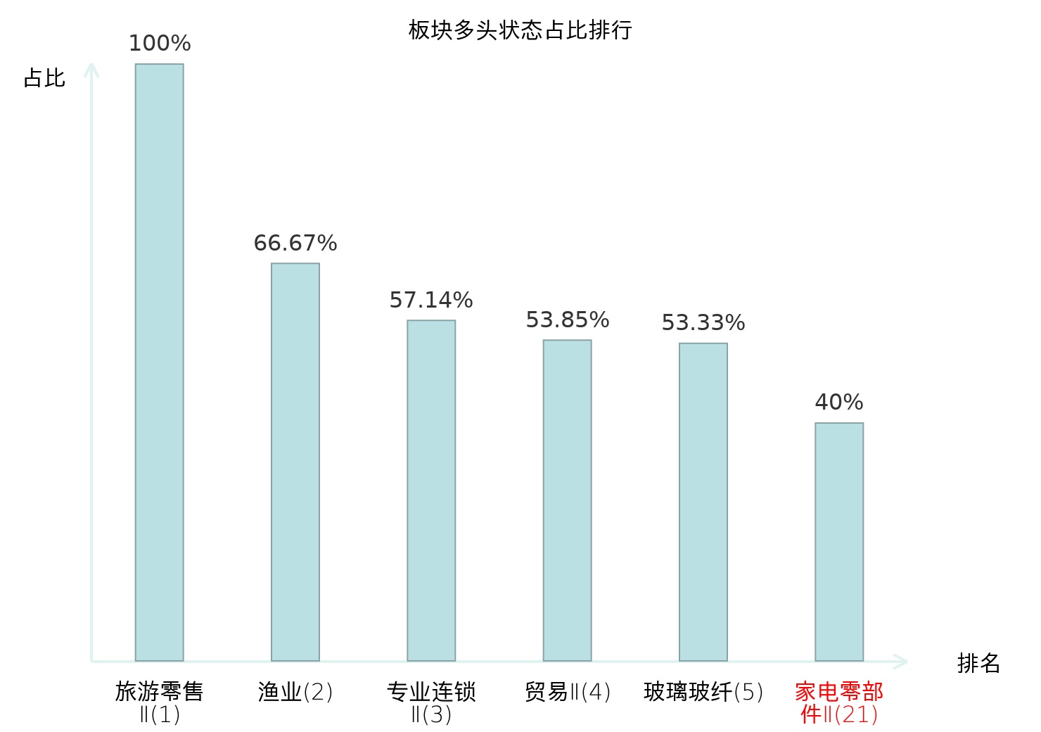 全市场所有行业板块中主力多头状态占比排名中,旅游零售Ⅱ板块位居第一。农业综合Ⅱ板块名次提升最快,较昨日上升83位。
