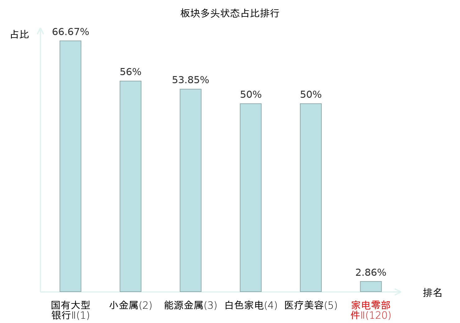 全市场所有行业板块中主力多头状态占比排名中,国有大型银行Ⅱ板块位居第一。酒店餐饮板块名次提升最快,较昨日上升59位。