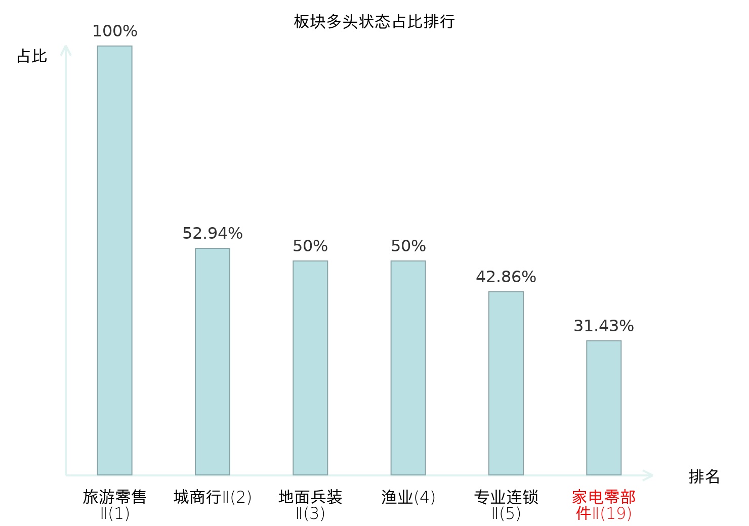 全市场所有行业板块中主力多头状态占比排名中,旅游零售Ⅱ板块位居第一。旅游及景区板块名次提升最快,较昨日上升69位。