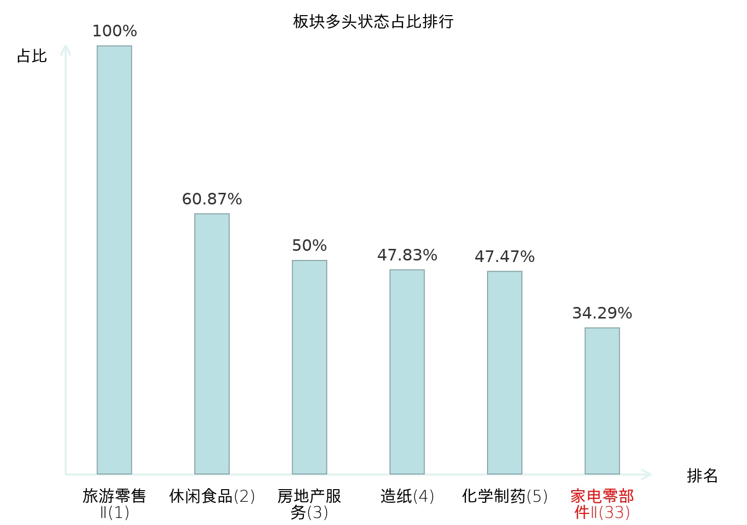全市场所有行业板块中主力多头状态占比排名中,旅游零售Ⅱ板块位居第一。种植业板块名次提升最快,较昨日上升49位。
